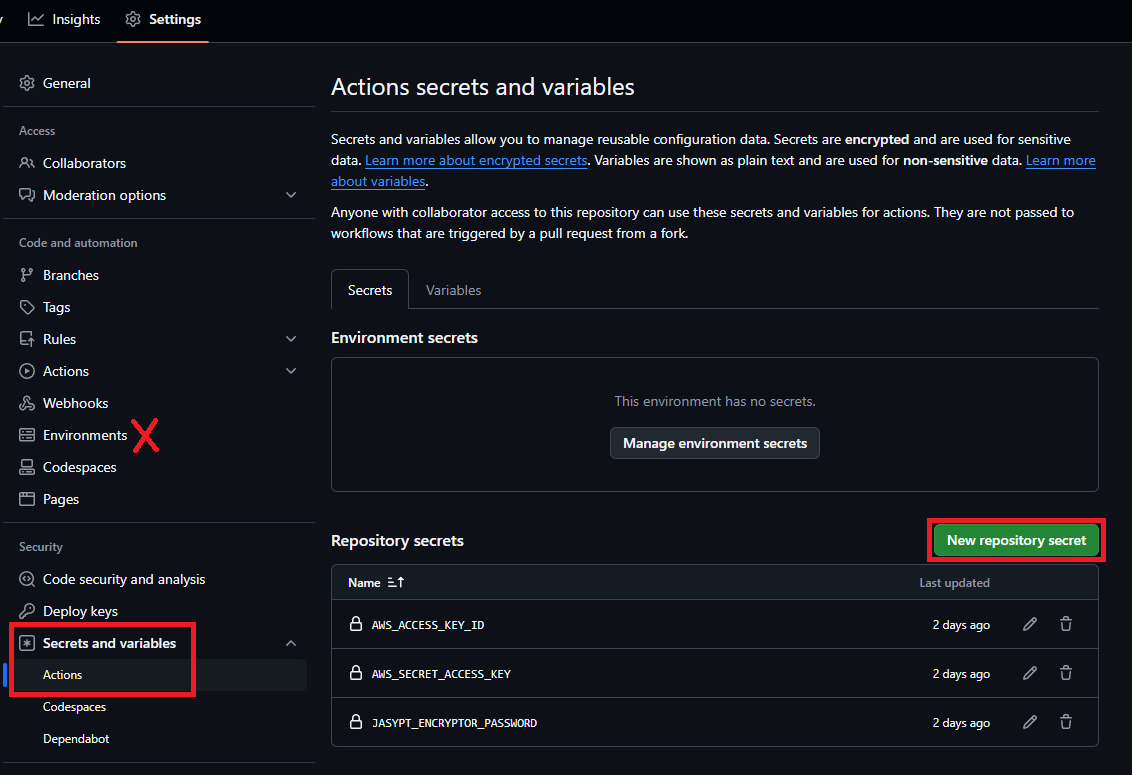✅ 원인 : Environments Secrets가 아니라 Repository Secrets에 설정했어야 했다!